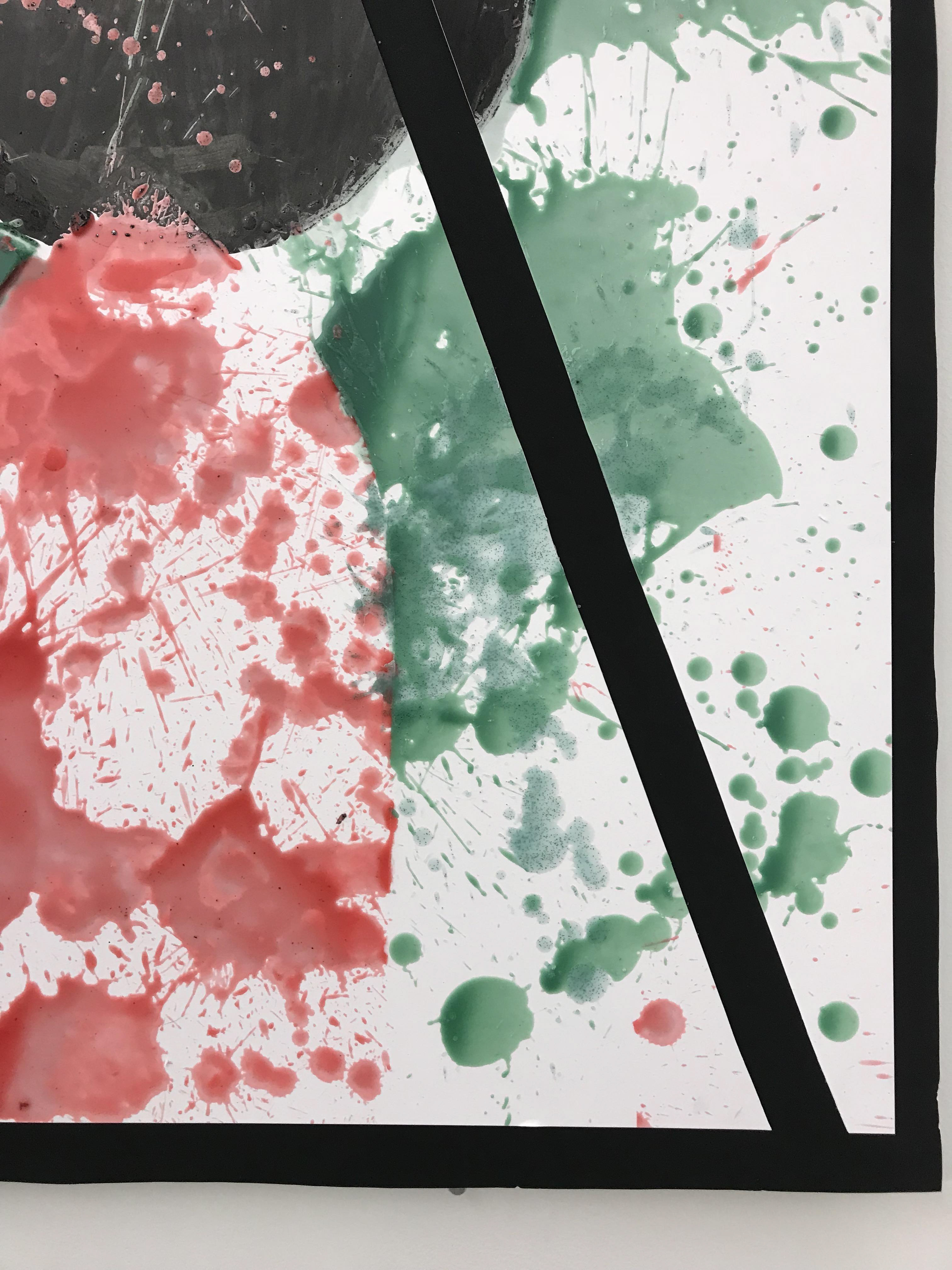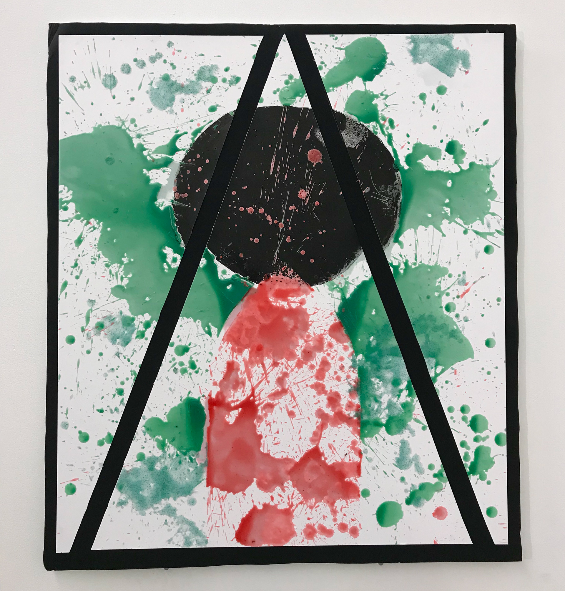 This abstract piece represents the bedroom door, splattered with candle wax the viewer is greeted with a pleasing scent, as a comfortable bedroom might invite you. The abstract shapes and color scheme directly relate to the artists bedroom.